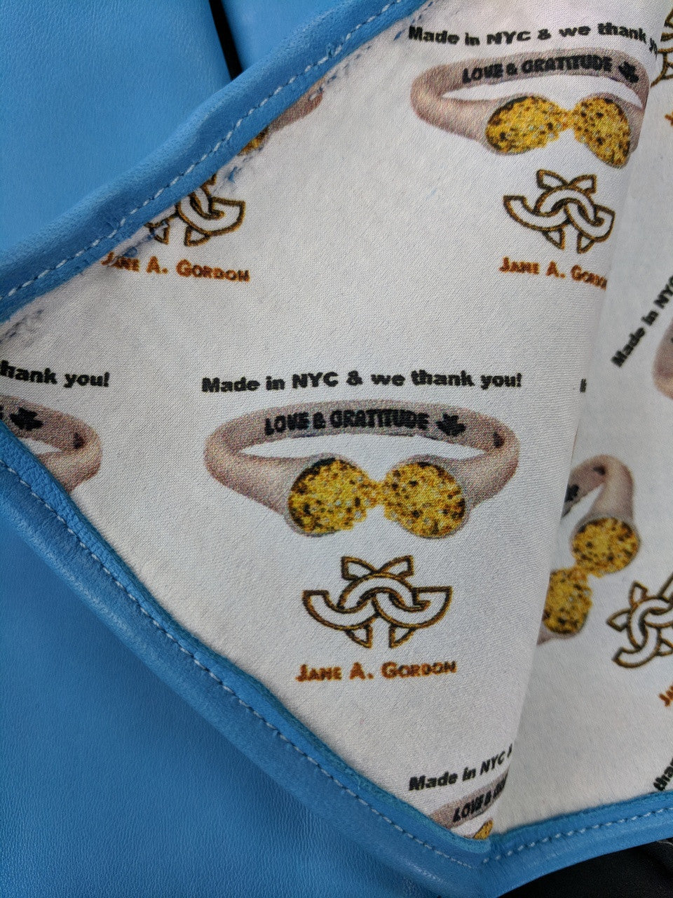 Shown here: sky blue gloves with genuine Freshwater pearls used as the buttons up the side. These have my signature silk, with "Love & Gratitude" as support for you, or whoever is wearing the gloves. Love & Gratitude, for me, is a recipe for happiness. Look with love, look for the best in everyone and every situation, have gratitude for our blessings, and we lift ourselves every day.