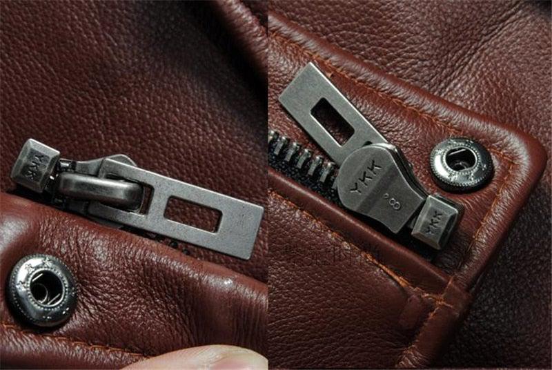 Bron Men's G1 Cowhide Tan/Black Leather Jacket is a stylish and durable choice. Crafted from cow leather, this jacket is sturdy and rigid, ensuring it will last a long time. It features real YKK zippers for durable use, and is fully lined with polyester satin lining. The turn-down collar and ruched detailing add a vintage touch. It is available in dark tan and black colors.
